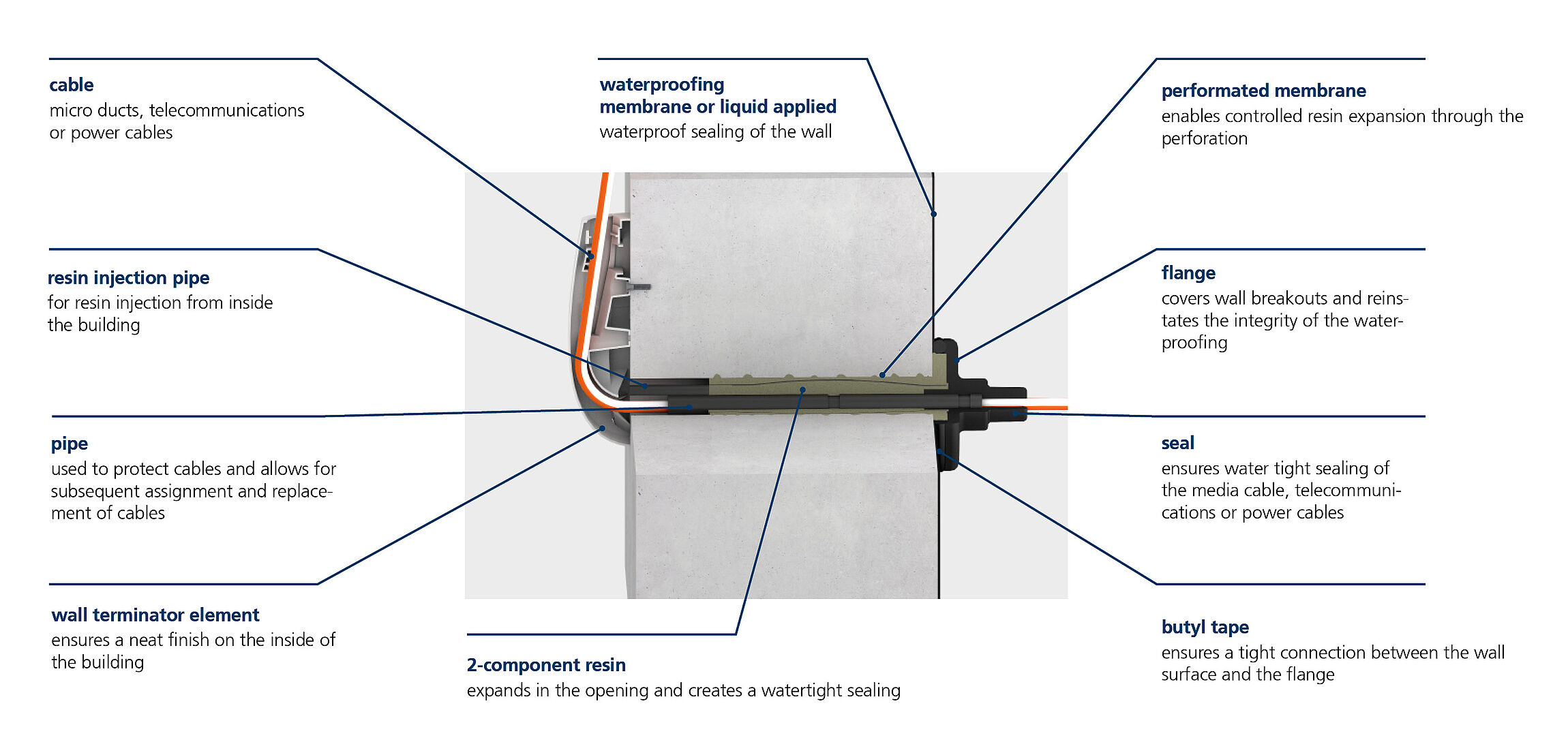 Cables and pipes are often installed in buildings retrospectively. This is usually necessary in existing buildings that are undergoing renovation. If no openings were provided for the installation of cables and pipes during the construction phase, then a core drilling is necessary. In order to protect the building from water and gases even after drilling through the wall, various sealing solutions have been developed for existing buildings. One of these is the membrane injection system, or short: MIS. The MIS system is suitable for sealing all types of walls, as well as for most wall sealing solutions.