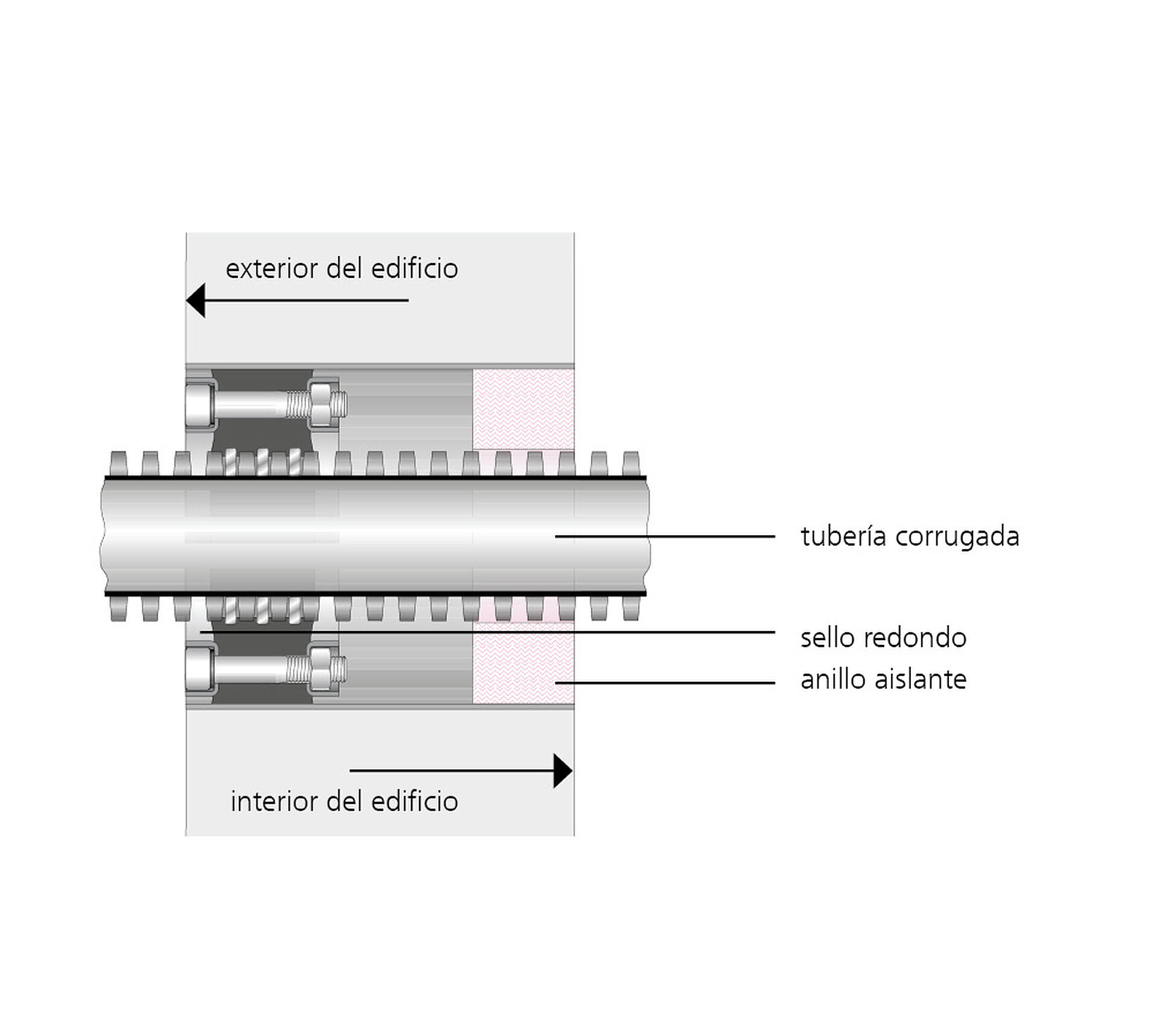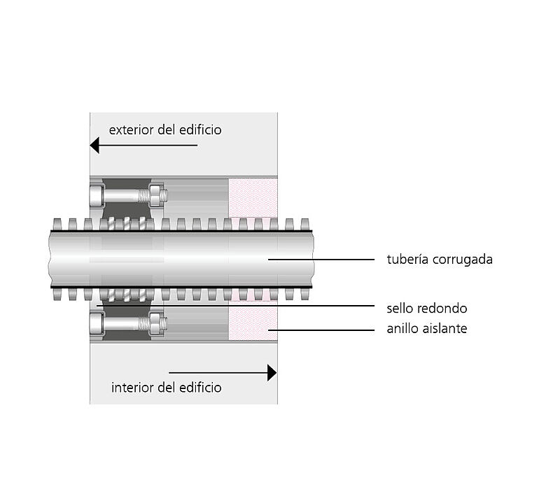 For sealing corrugated cable ducts and media pipes. The patented ring clips in the corrugated section prevent deformations and damage to the corrugated pipe and at the same time keep the closing pressure of the press seal uniform and constant. The insulation ring included in the scope of supply centres the corrugated pipe on the inside of the building and neatly finishes the wall connection.